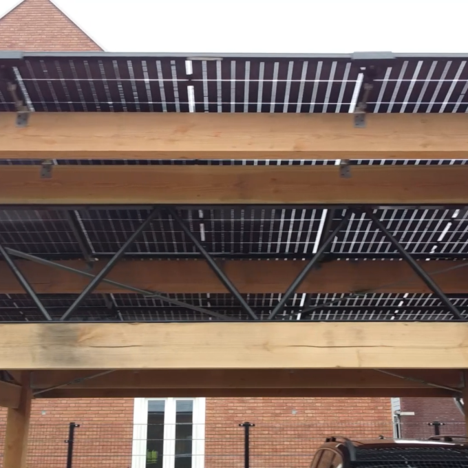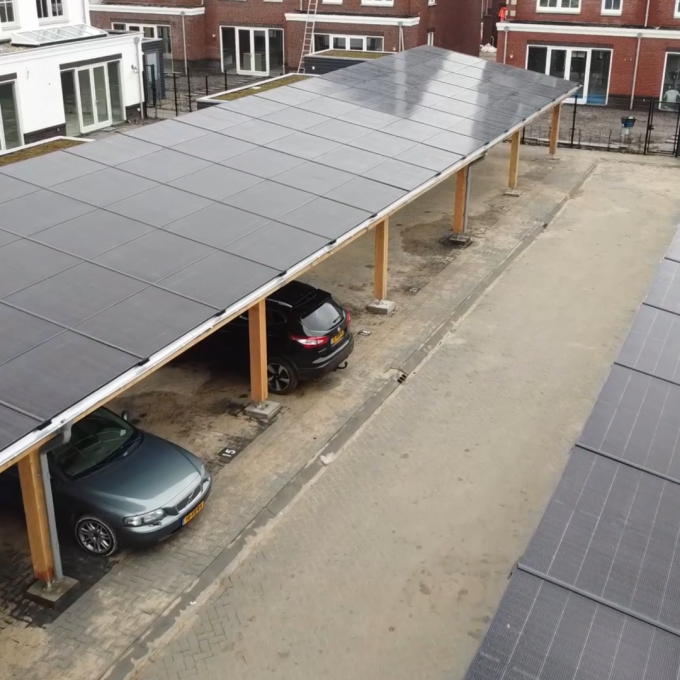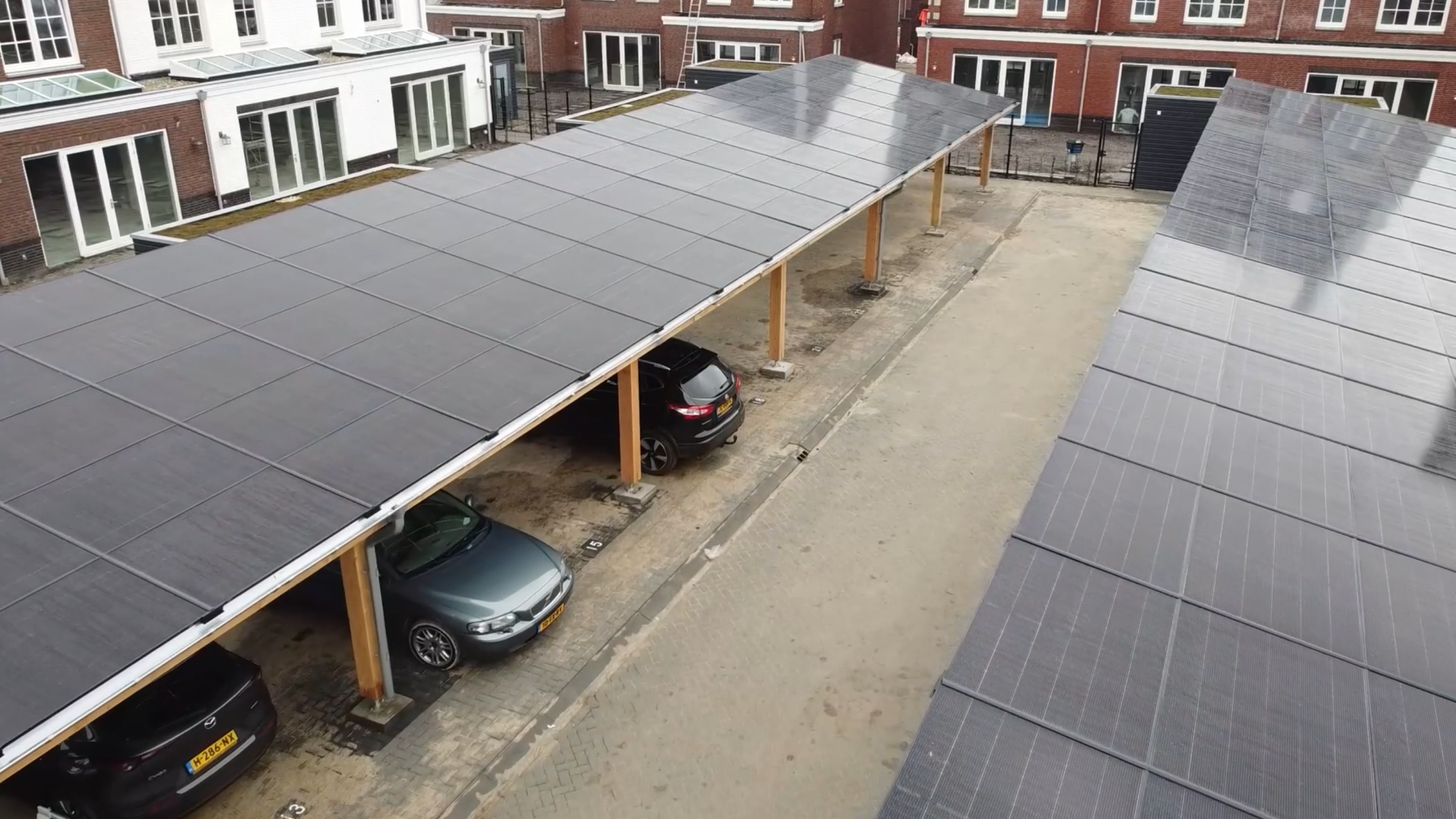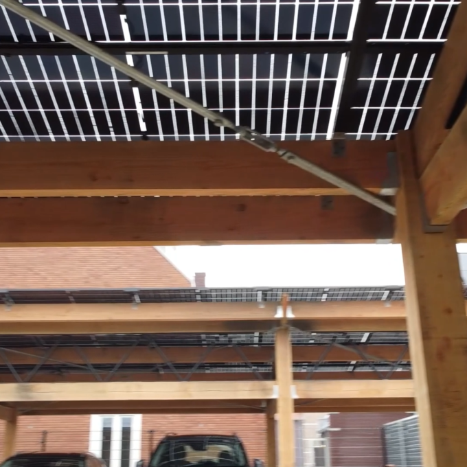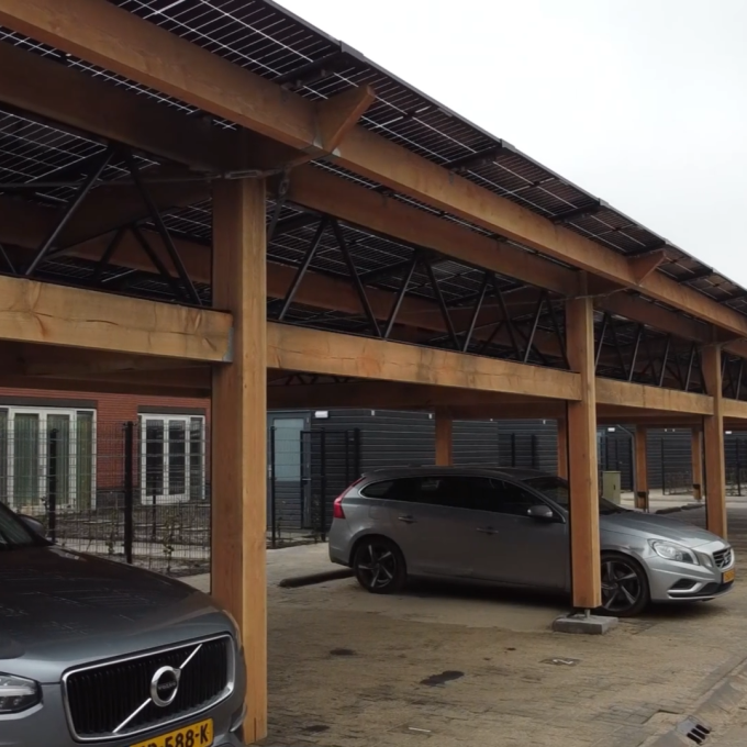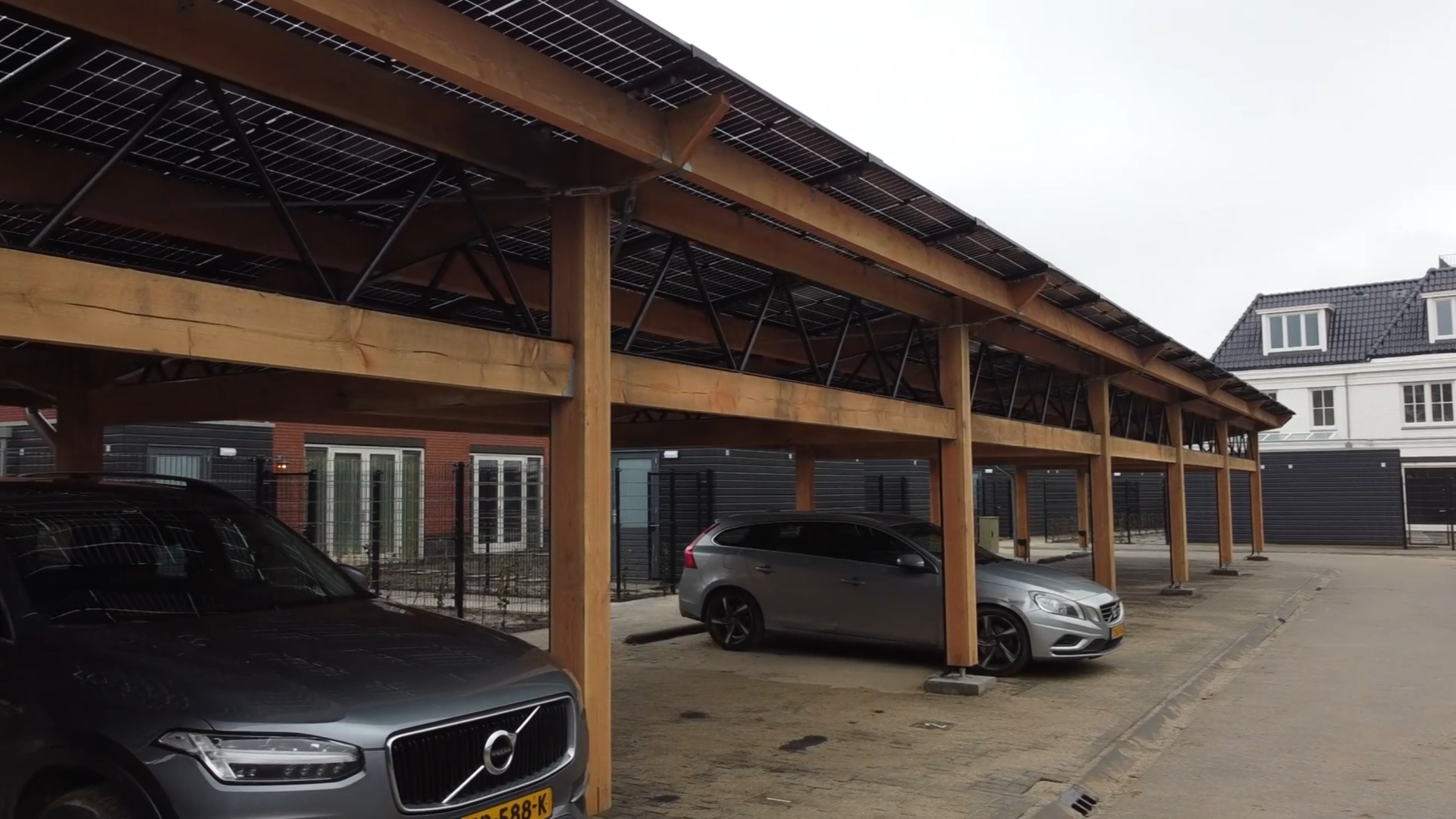 De combinatie met de houten onderbouw geeft de solaroverkapping een warme uitstraling. De Lessenaarsdaken zijn gerealiseerd met een relatief nieuw montagesysteem waarbij de geframde zonnepanelen boven elkaar zijn geplaatst. Dit zorgt ervoor dat grotere afstanden van nok tot goot kunnen worden overbrugt. Het zwart geanodieerde systeem geeft een luxe uitstraling die goed overeenkomt met de onderbouw. Dankzij de carports worden de omliggende woningen van groene stroom voorzien en zijn de auto's van de bewoners goed beschermd tegen de weersinvloeden.