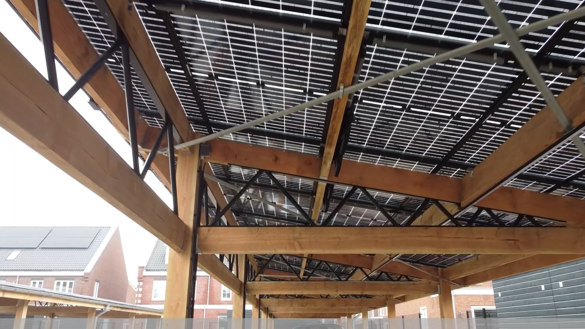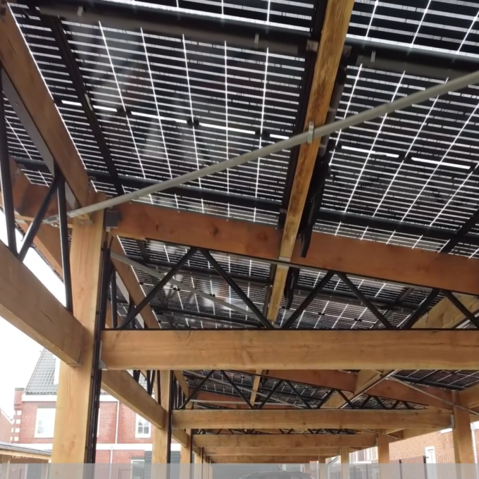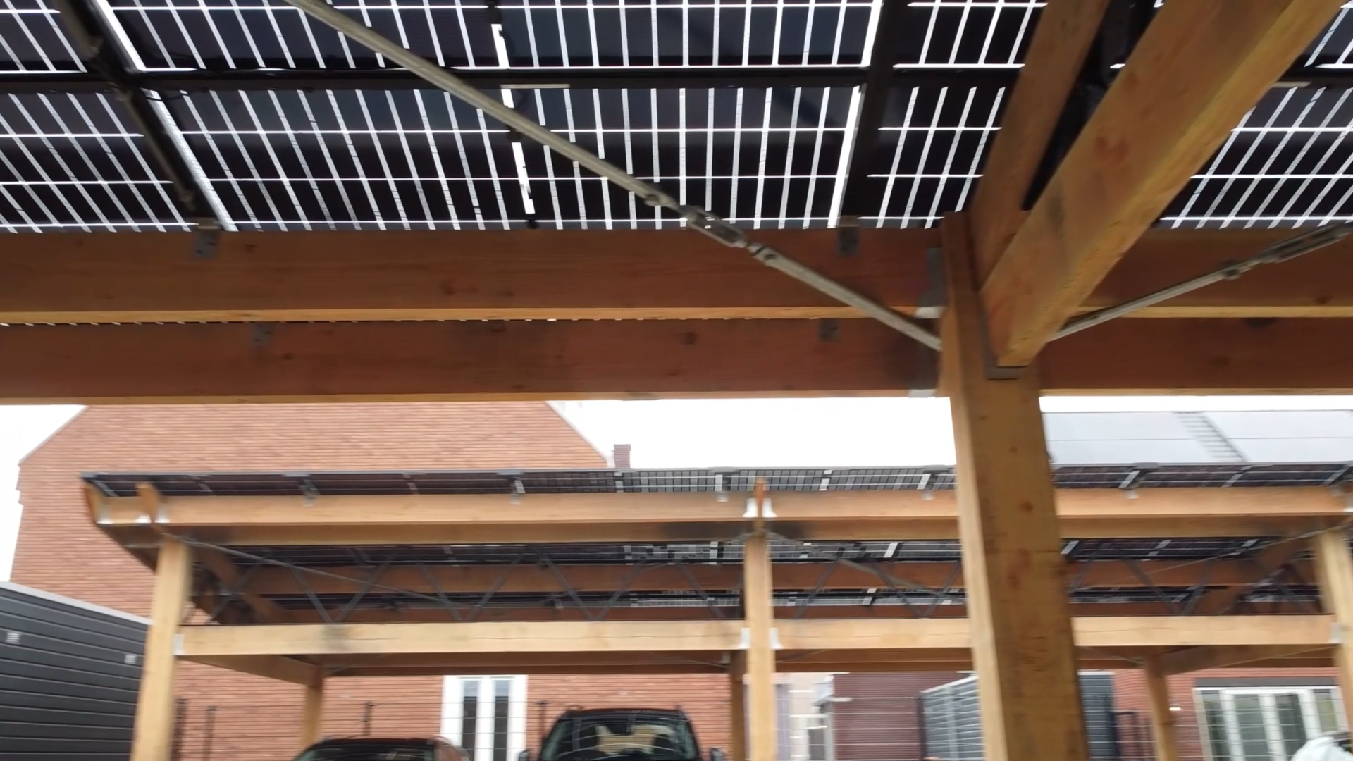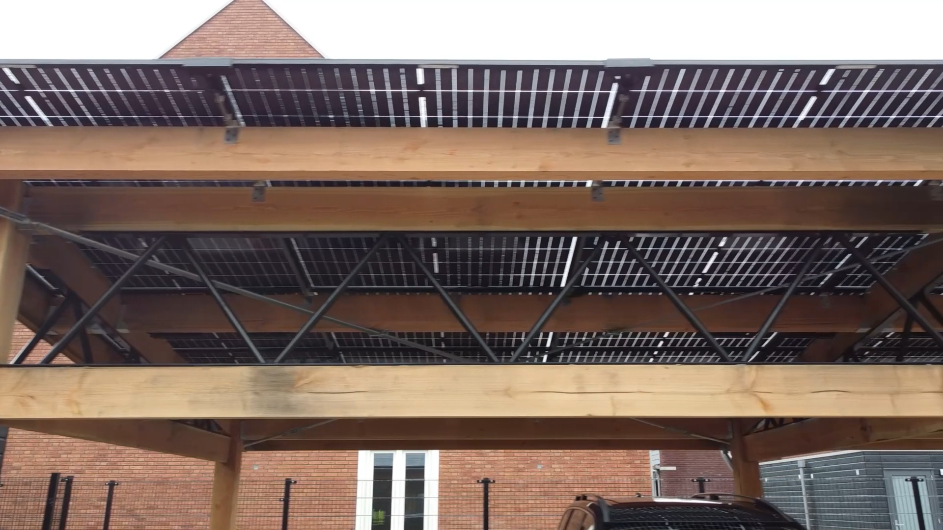 De combinatie met de houten onderbouw geeft de solaroverkapping een warme uitstraling. De Lessenaarsdaken zijn gerealiseerd met een relatief nieuw montagesysteem waarbij de geframde zonnepanelen boven elkaar zijn geplaatst. Dit zorgt ervoor dat grotere afstanden van nok tot goot kunnen worden overbrugt. Het zwart geanodieerde systeem geeft een luxe uitstraling die goed overeenkomt met de onderbouw. Dankzij de carports worden de omliggende woningen van groene stroom voorzien en zijn de auto's van de bewoners goed beschermd tegen de weersinvloeden.