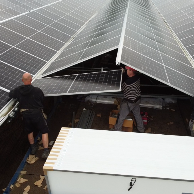 Afdelingen A en B zijn uitgevoerd met 5.600 zonnepanelen op kapmaten van 4.00m. Afdeling C en D zijn uitgevoerd met 5.872 zonnepanelen op 3.20m kappen. Hierbij zijn standaard zonnepanelen in verschillende lengte geselecteerd en zijn de kappen in verschillende dakhellingen gebouwd om de juiste combinatie tussen de kapmaat en paneellengte te vinden. Door het hergebruik van de bestaande goten ontstond een mooie uitdaging voor de projectengineering omdat in het project verschillende goten waren opgenomen, waaronder ACS, APD en HI+.